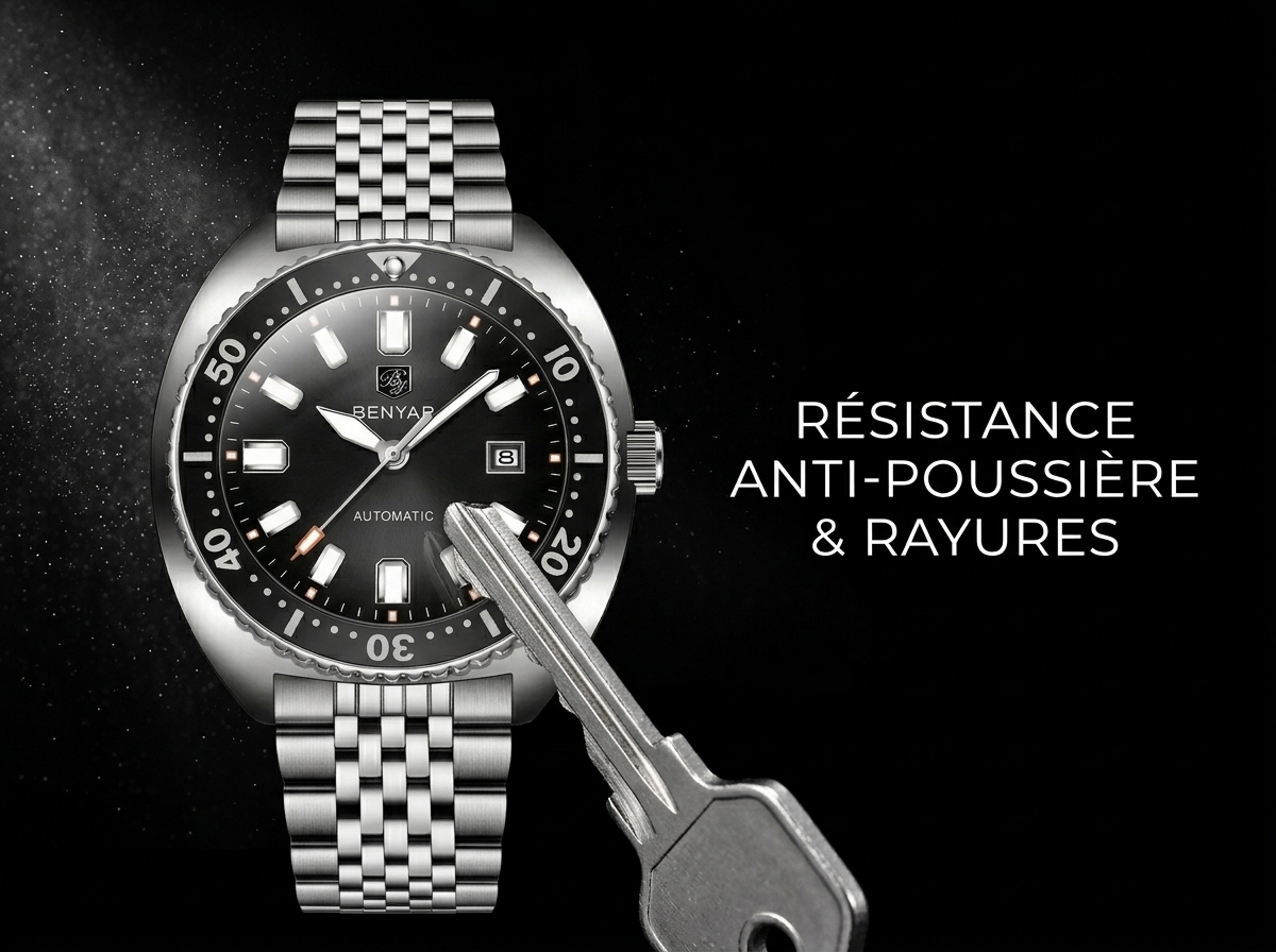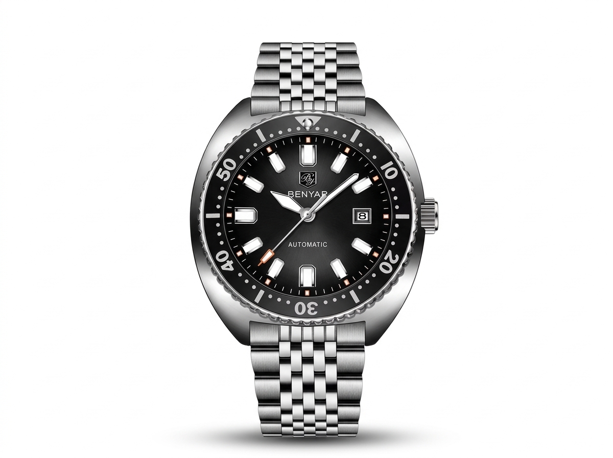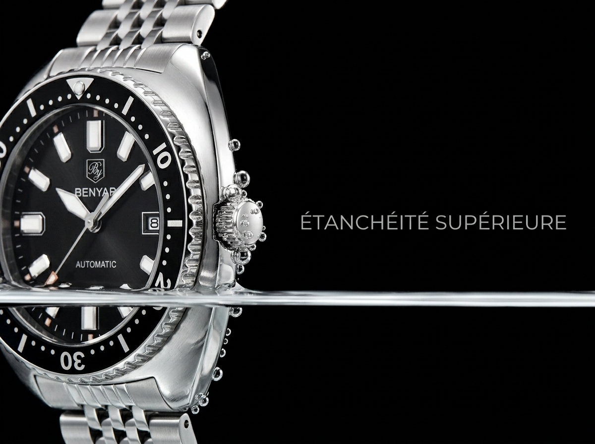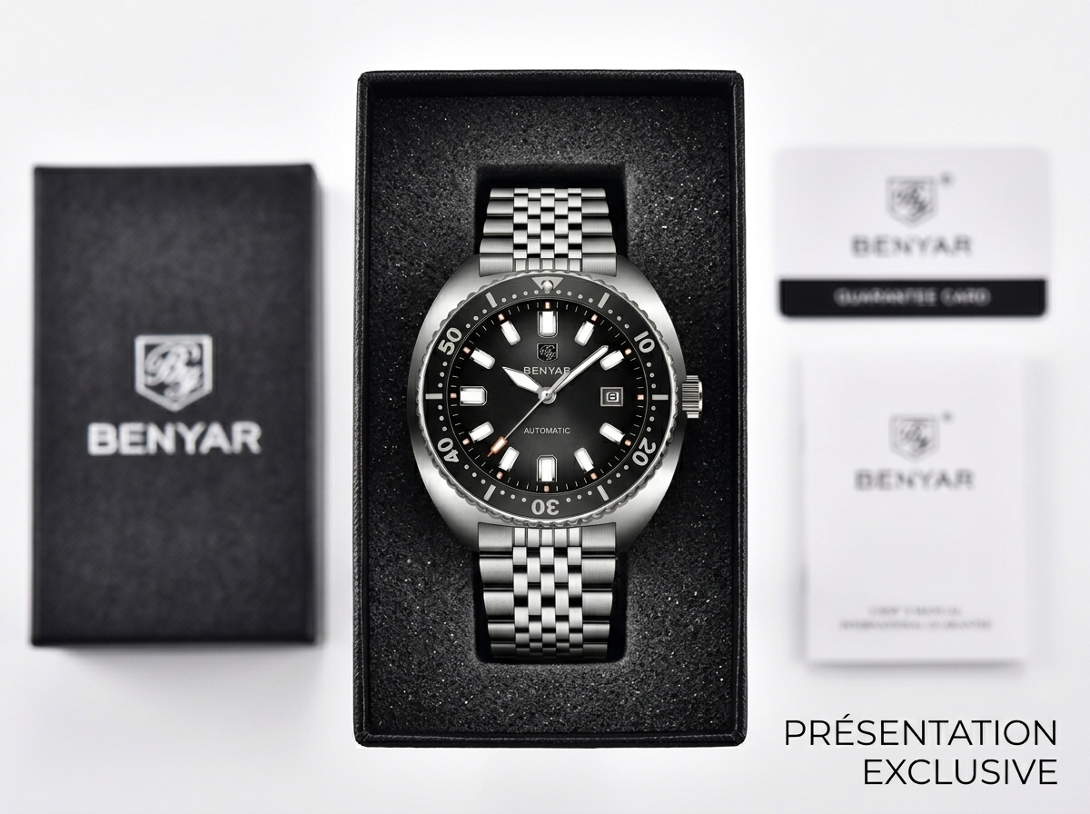 Découvrez la montre Benyar automatique, un mariage parfait entre robustesse et élégance intemporelle pour l’homme moderne. Son design inspiré des plongeuses et son bracelet en acier inoxydable en font un accessoire indispensable pour toutes vos aventures.