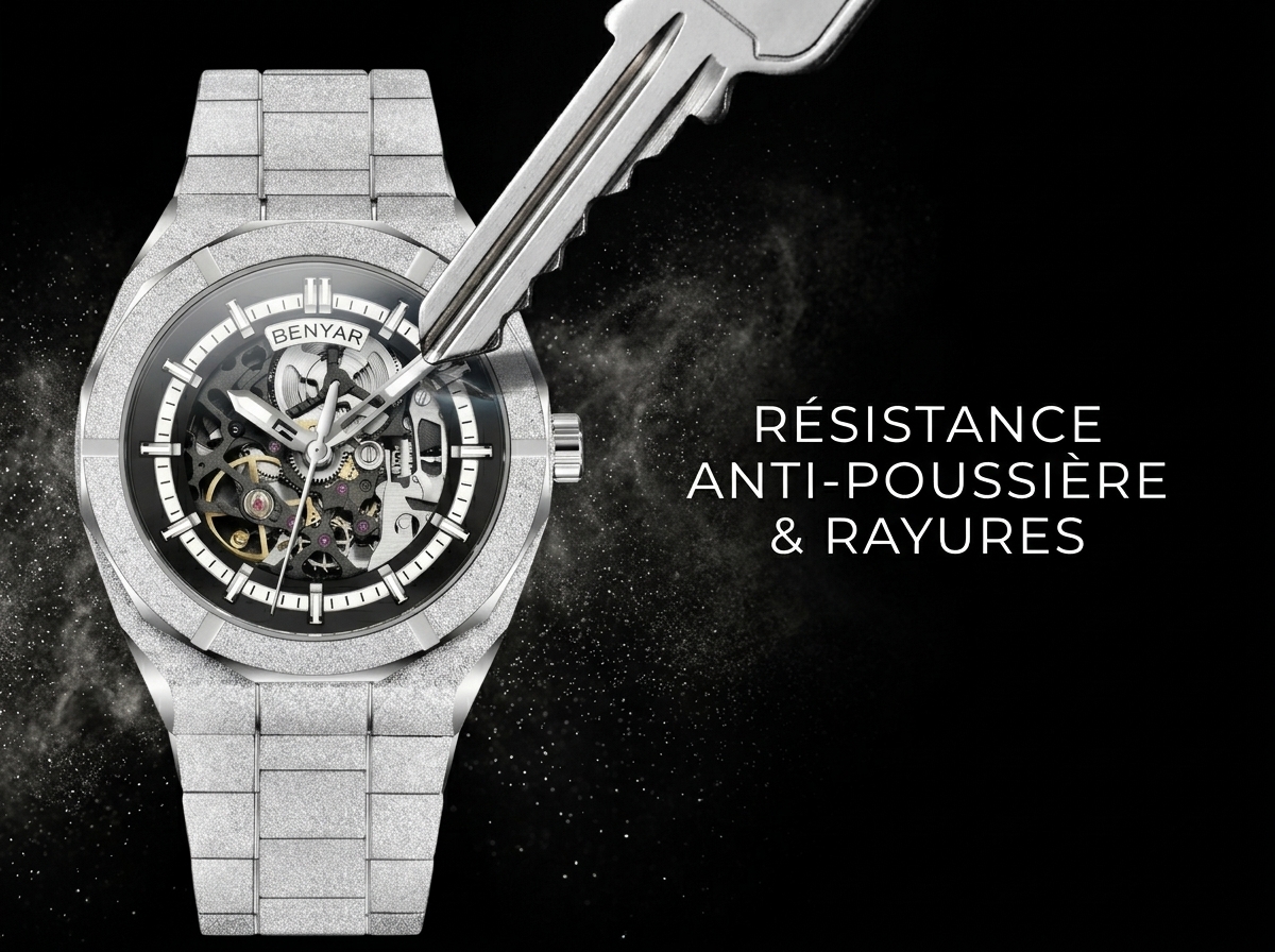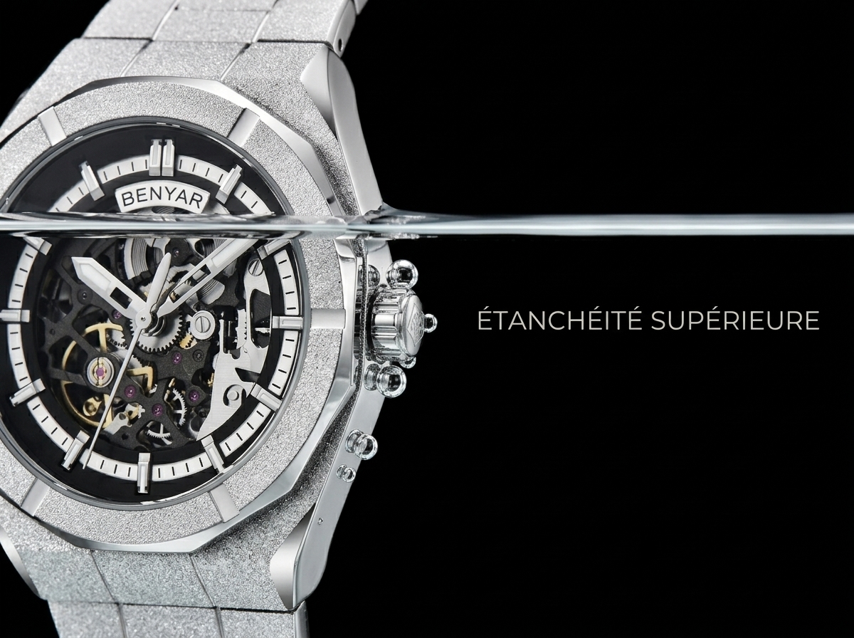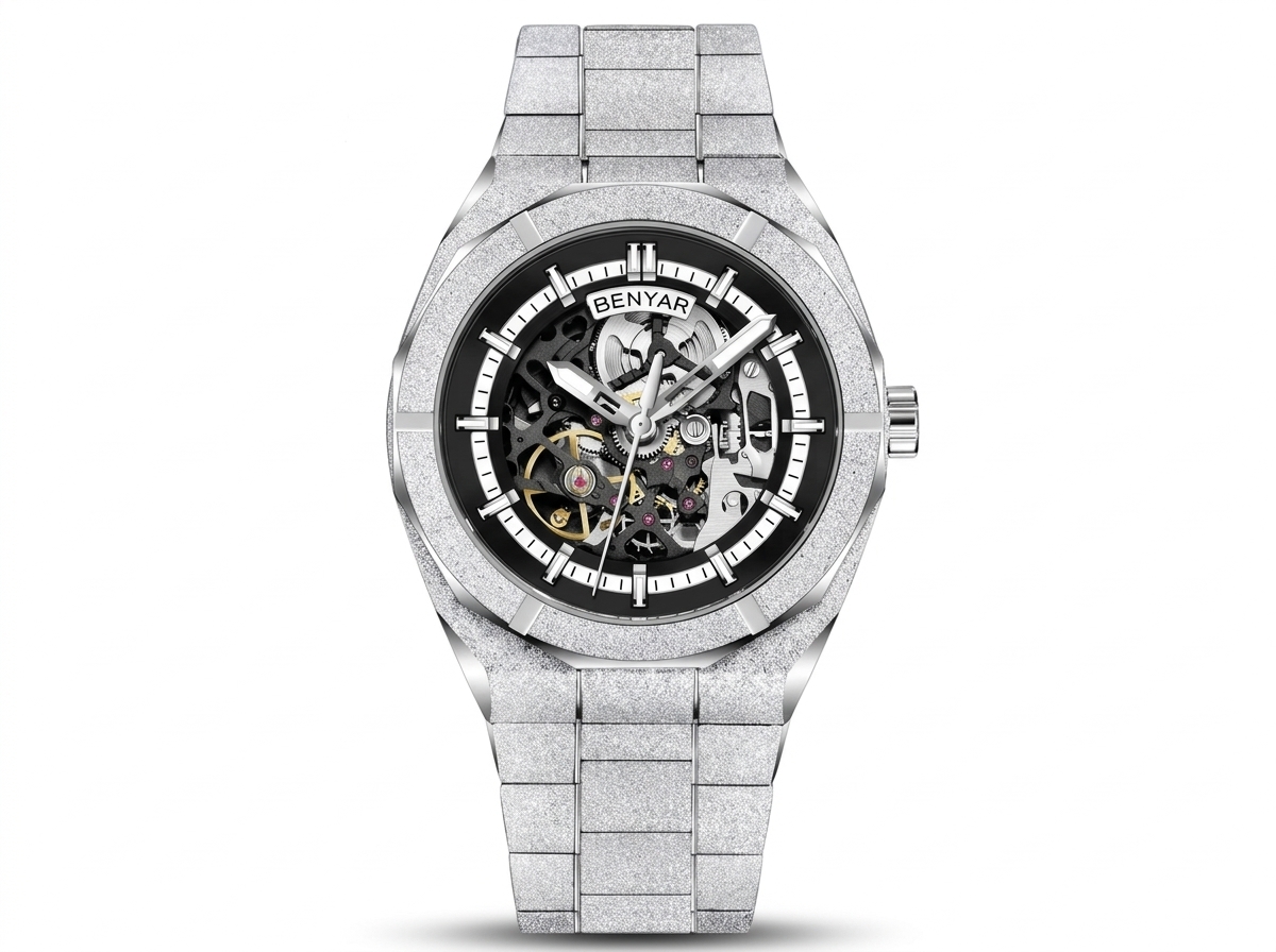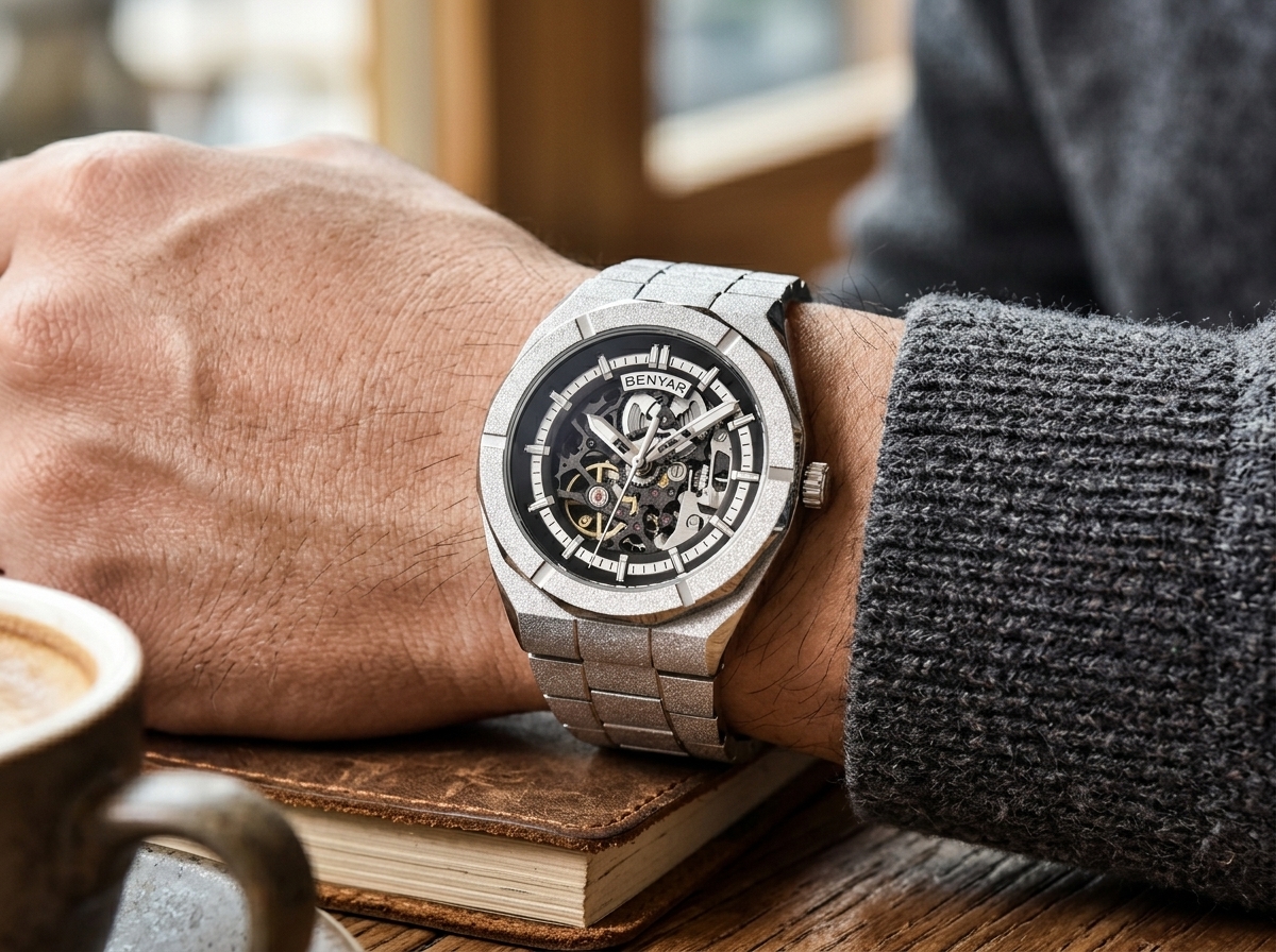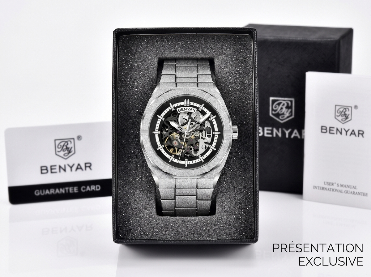 Élevez votre style avec cette montre audacieuse BENYAR, dotée d’un cadran squelette hypnotisant et d’une finition scintillante qui capture la lumière. Son design mécanique sophistiqué et son bracelet en acier inoxydable texturé en font une pièce maîtresse incontournable pour toute collection.