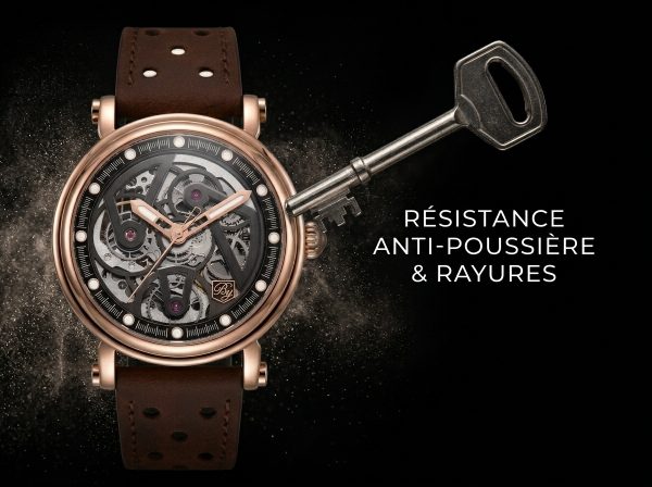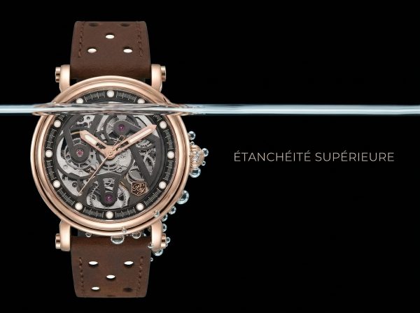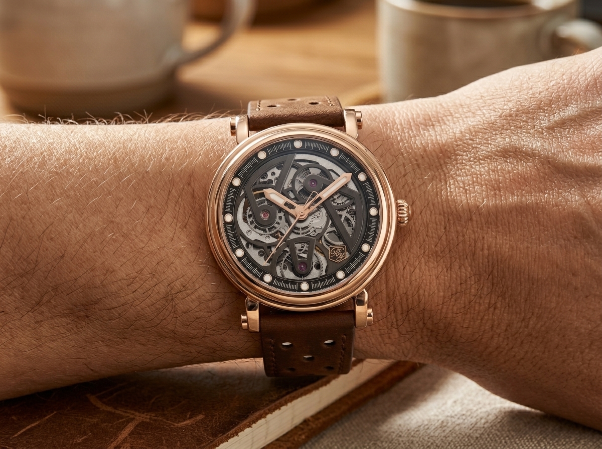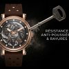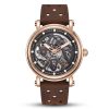 Adoptez l’élégance audacieuse de cette montre squelette en or rose, une pièce d’horlogerie qui dévoile avec art la danse hypnotisante de son mouvement automatique. Son design raffiné est sublimé par un bracelet en cuir perforé brun, mariant luxe classique et esprit contemporain.