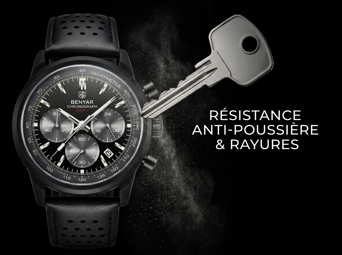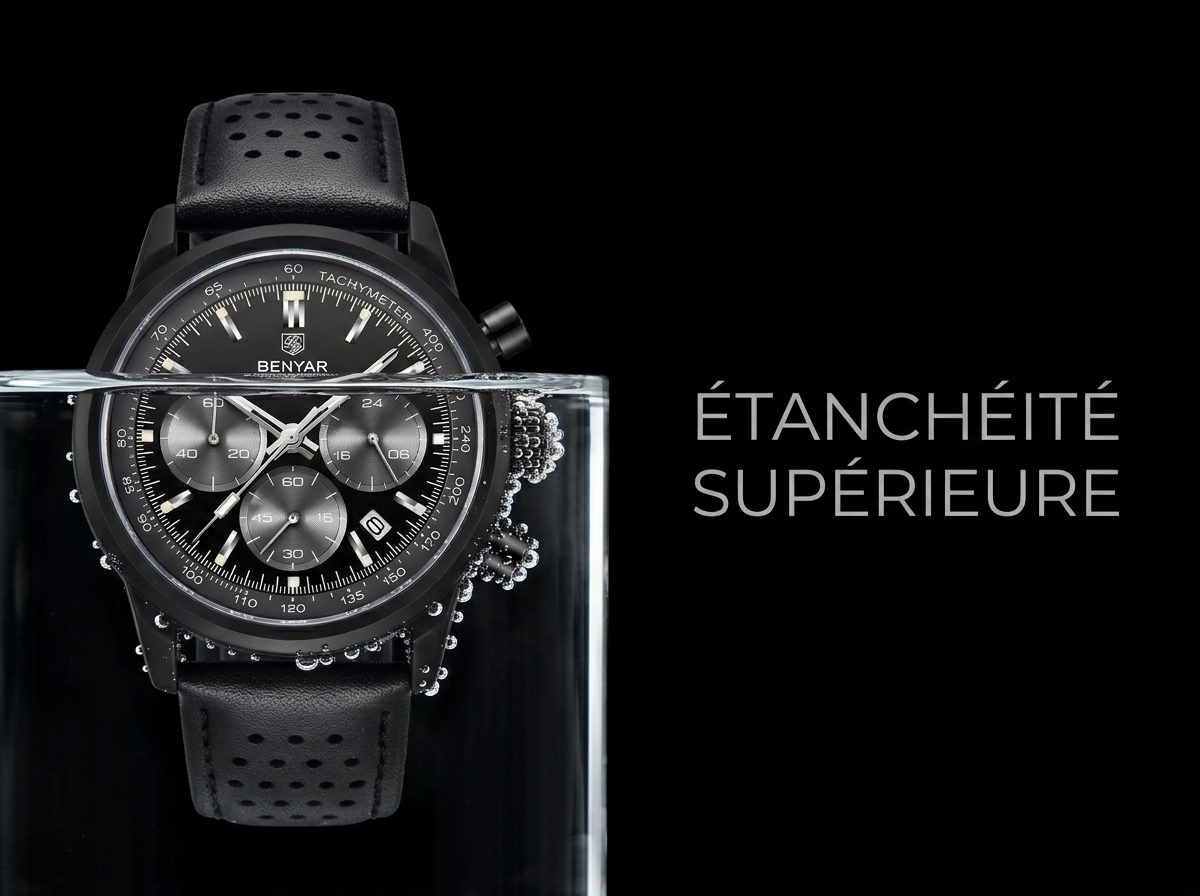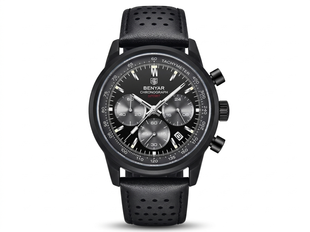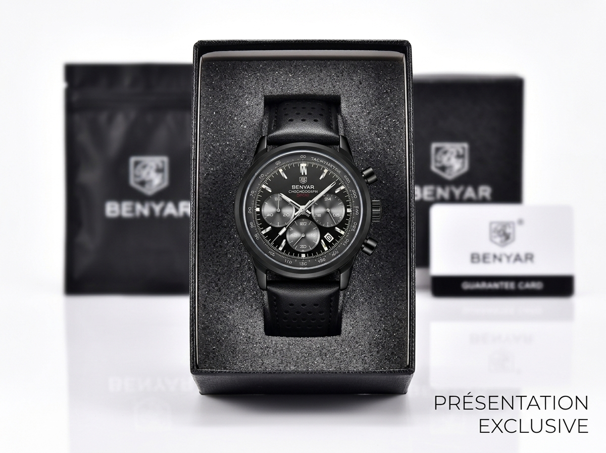 Découvrez la montre chronographe Benyar, alliance parfaite de style sportif et d’une sophistication discrète pour le quotidien. Son cadran noir multifonctionnel et son bracelet en cuir perforé offrent une allure dynamique et un confort inégalé.