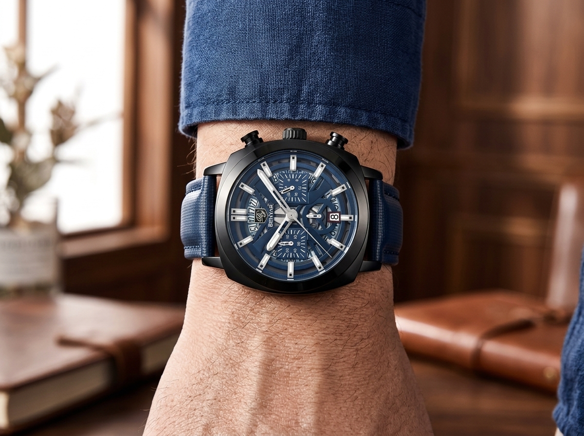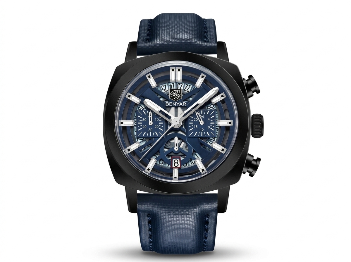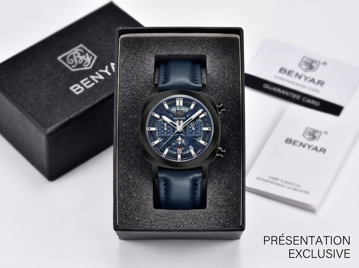 Découvrez la montre BENYAR, une fusion audacieuse de design sportif et d’élégance moderne. Son cadran bleu multicouche et son boîtier angulaire en font un accessoire incontournable pour l’homme contemporain.