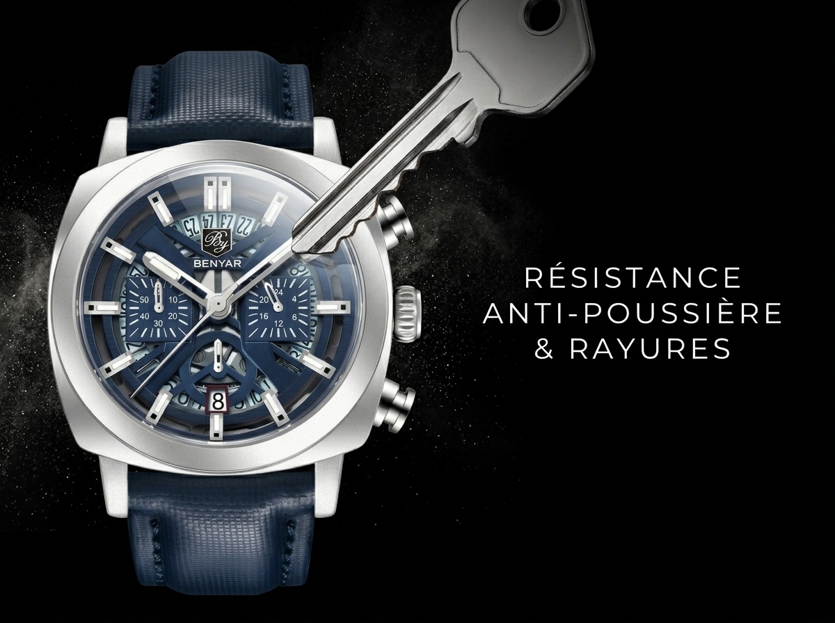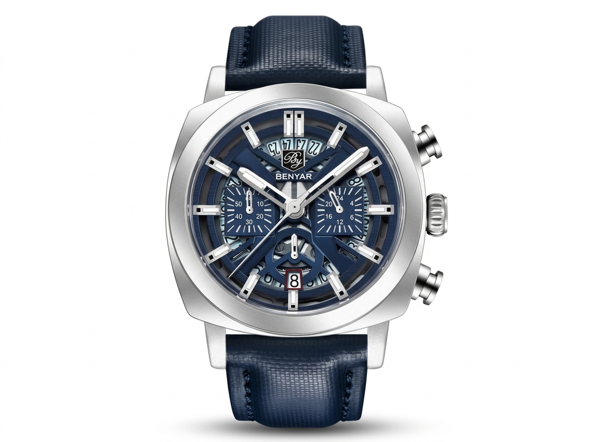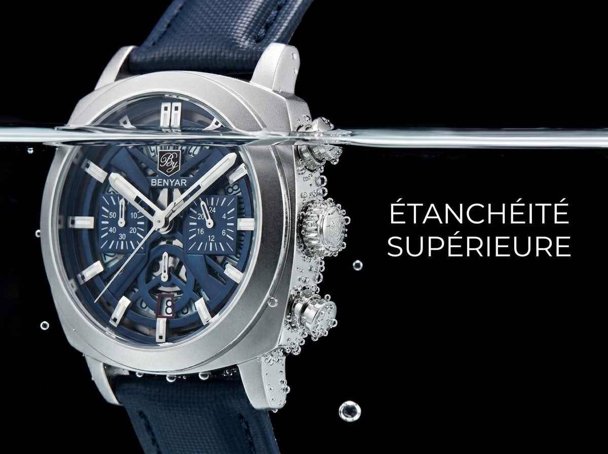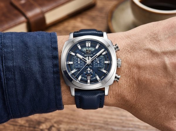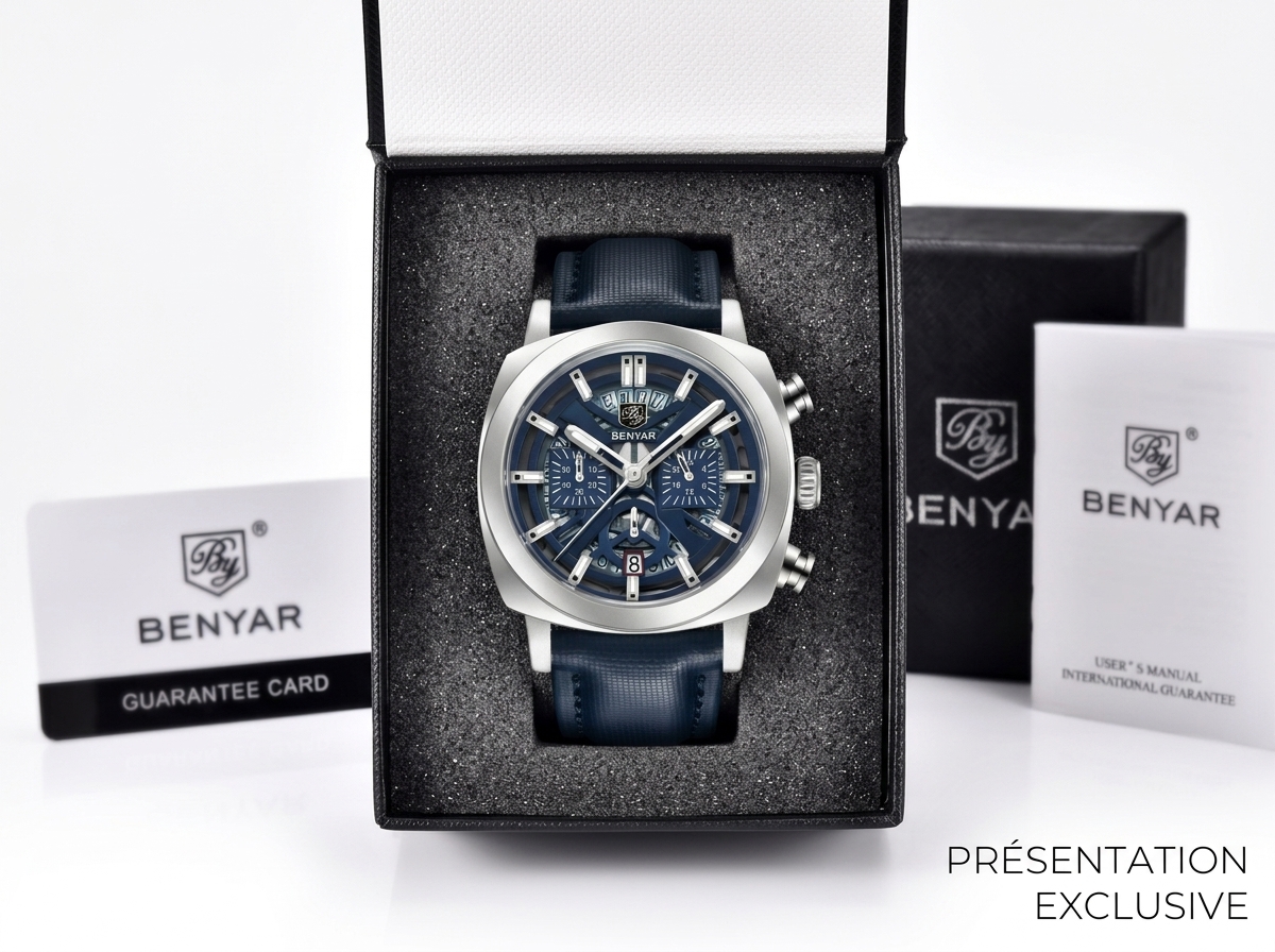 Affirmez votre style avec la montre chronographe BENYAR, une pièce audacieuse au cadran bleu profond et au design distinctif. Son allure sportive et élégante en fait l’accessoire parfait pour rehausser chaque tenue.