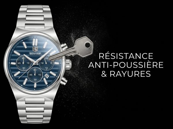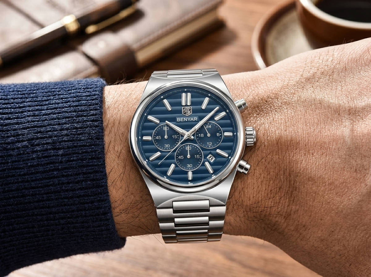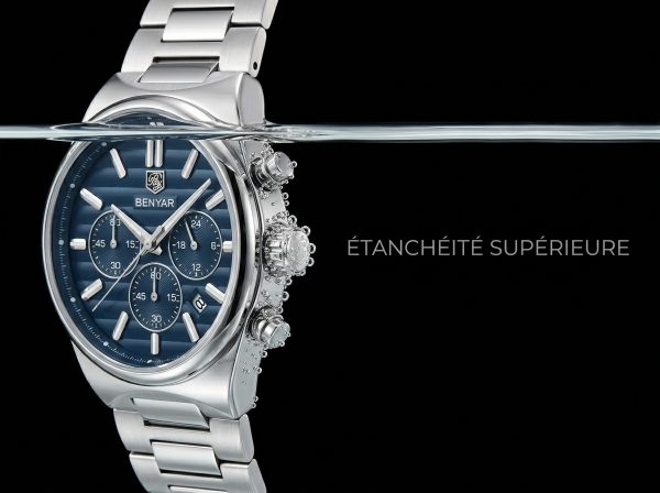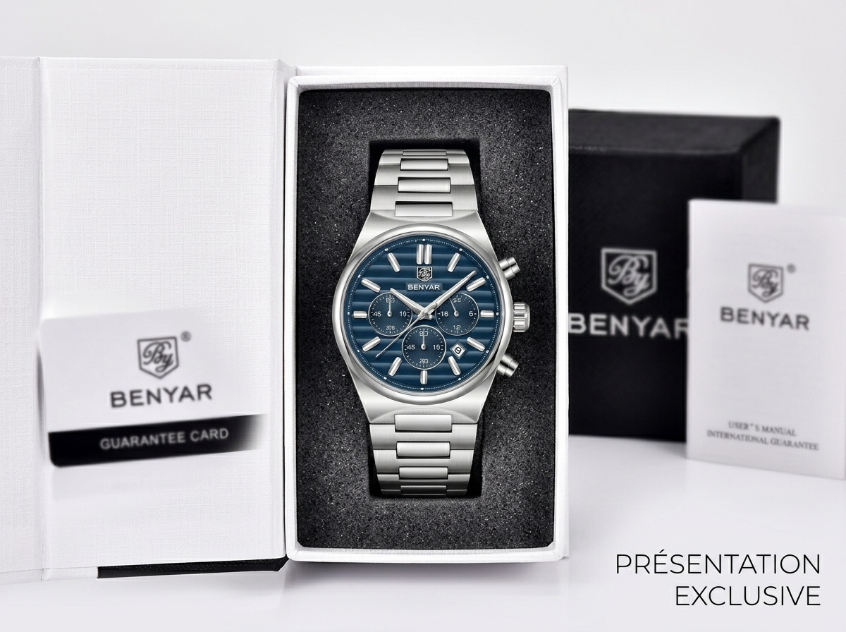 Ce chronographe Benyar allie une esthétique sportive raffinée à la robustesse d’un boîtier en acier inoxydable. Son cadran bleu profond et ses fonctions précises en font un accessoire idéal pour l’homme moderne et actif.