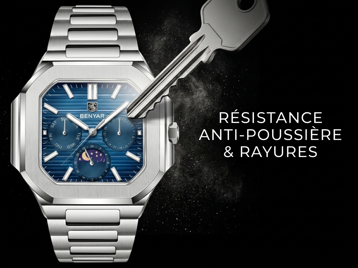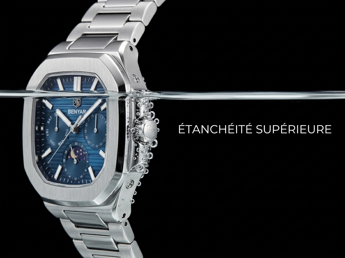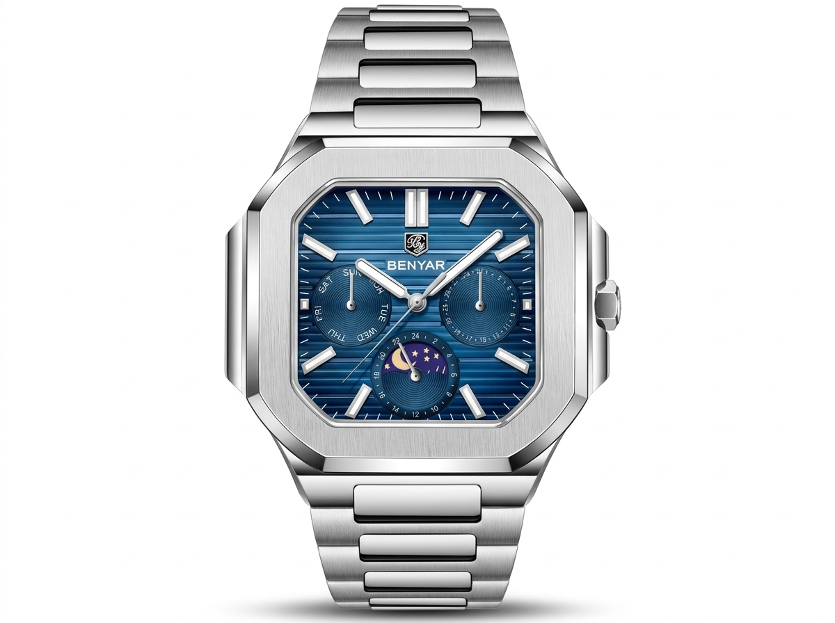Découvrez l’élégance audacieuse de cette montre BENYAR, une fusion parfaite de robustesse et de raffinement. Son cadran bleu texturé et ses multiples complications en font un accessoire incontournable pour l’homme moderne.