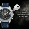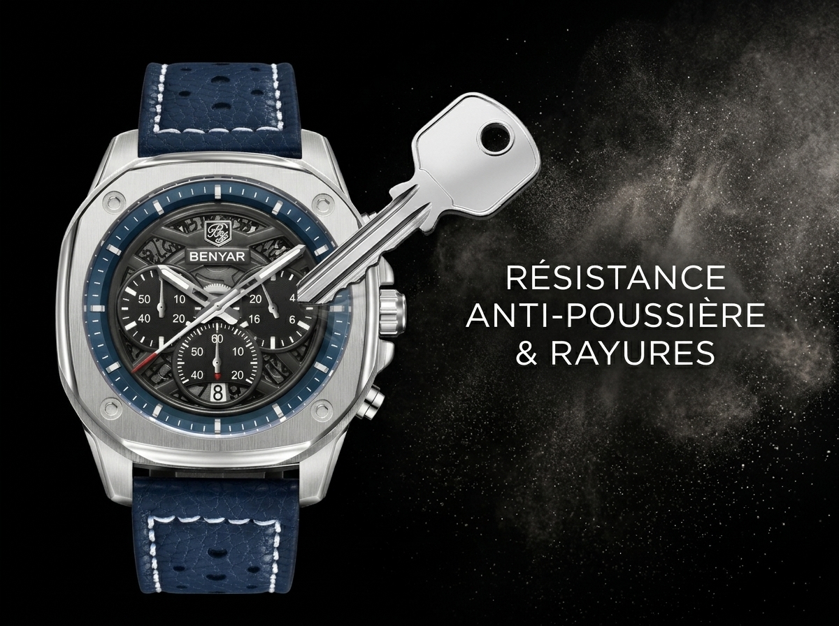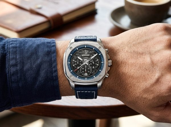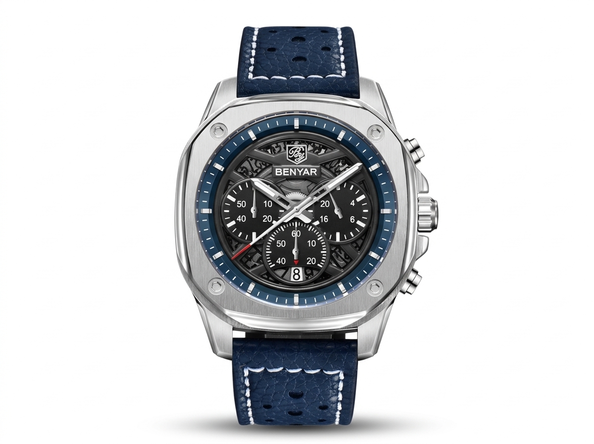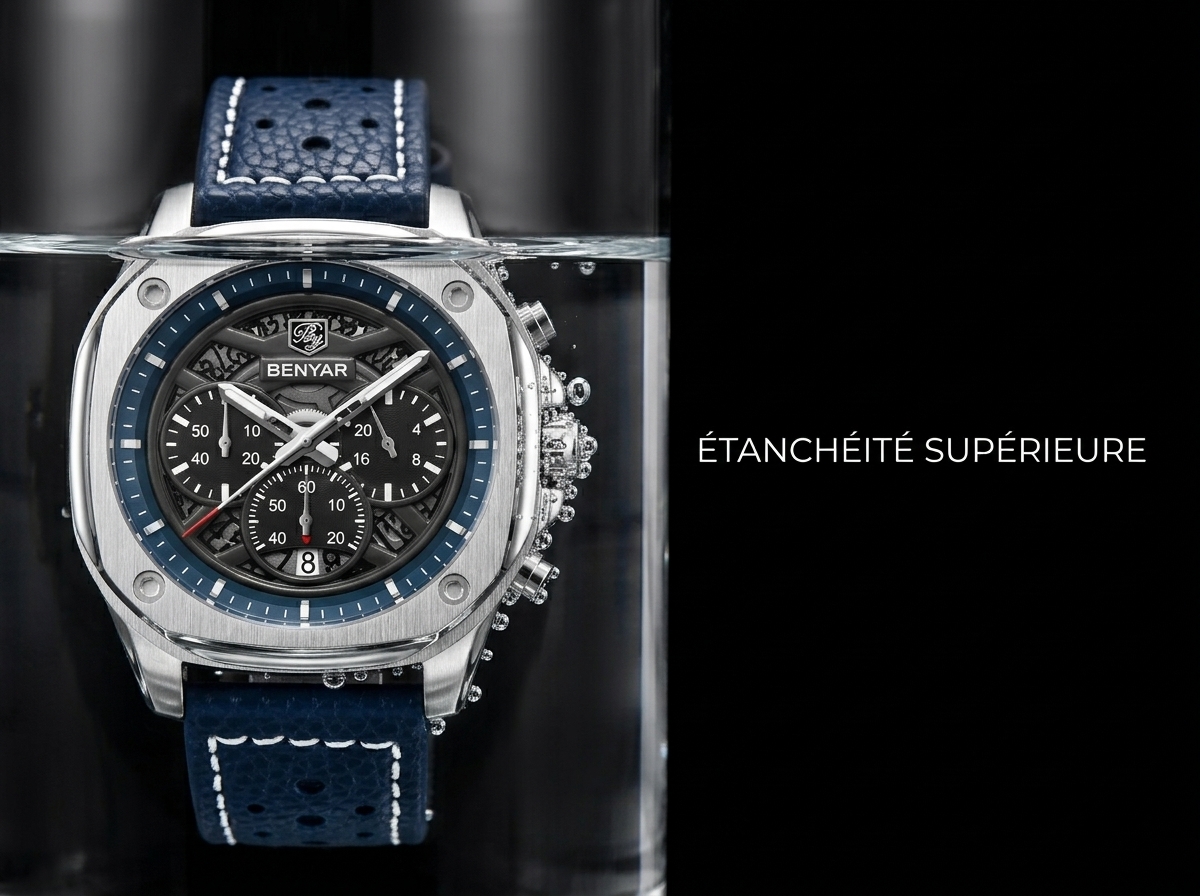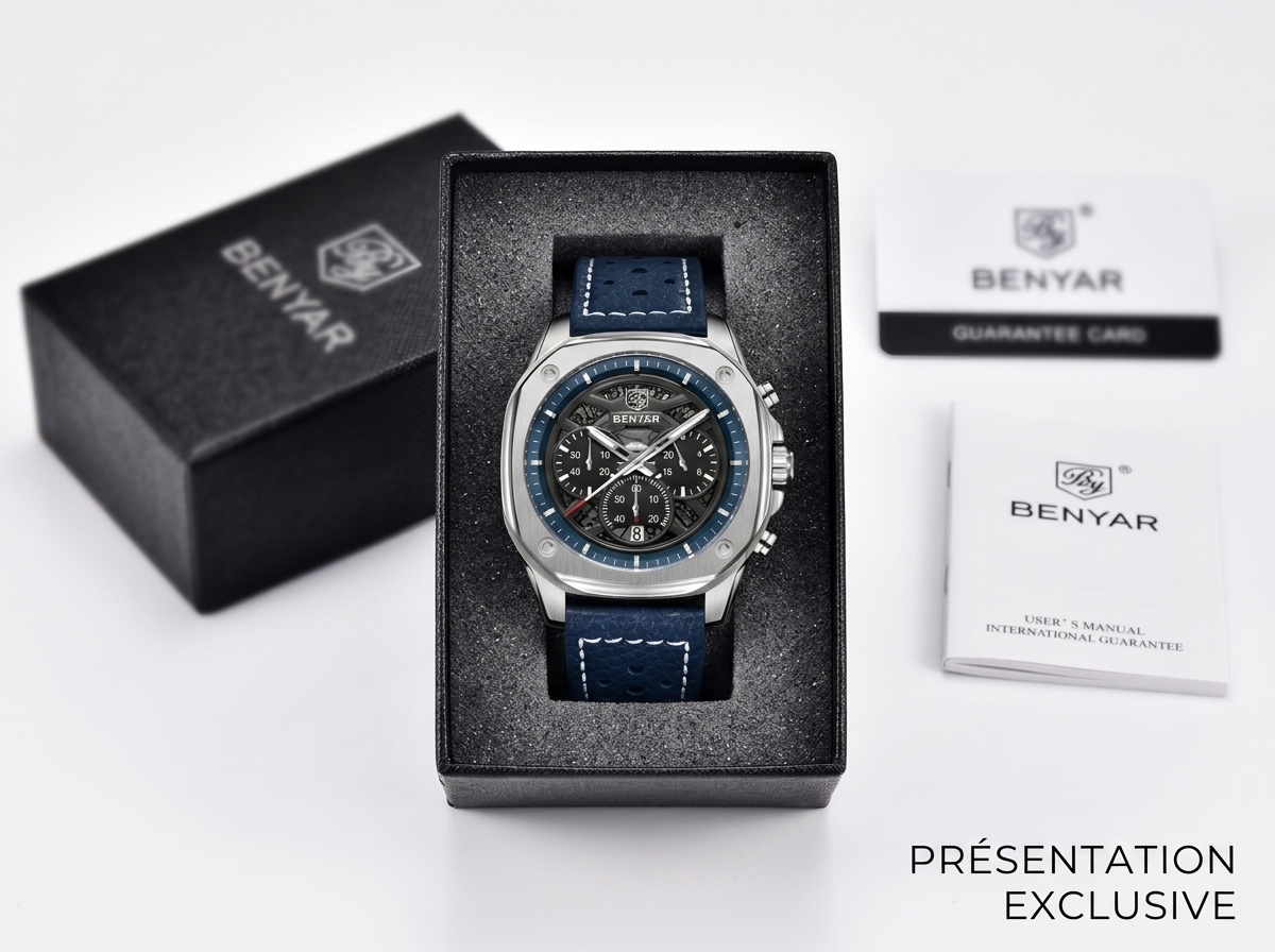 Adoptez un look sportif et sophistiqué avec cette montre chronographe BENYAR, combinant un boîtier robuste en acier inoxydable brossé et un cadran noir texturé. Son bracelet en cuir perforé bleu marine avec surpiqûres contrastantes assure un confort optimal et une allure audacieuse pour toutes vos aventures.