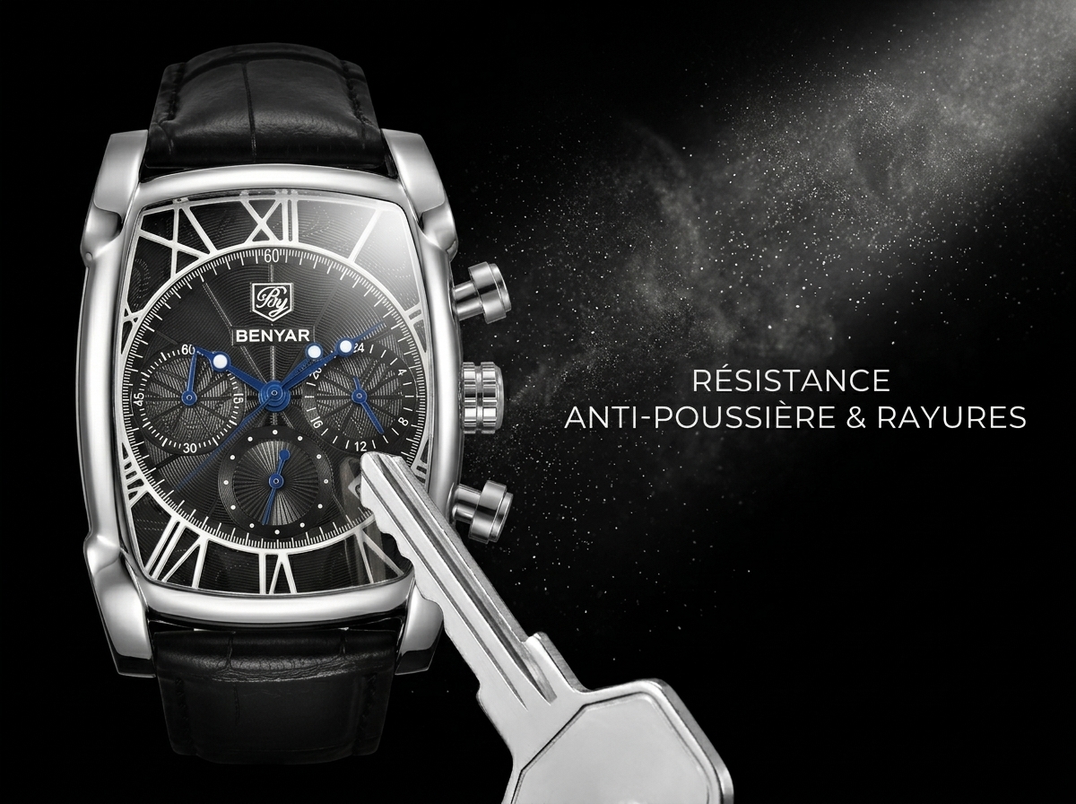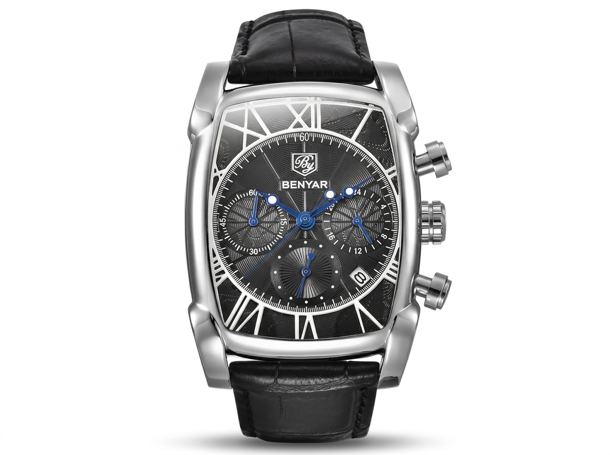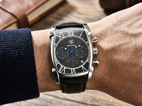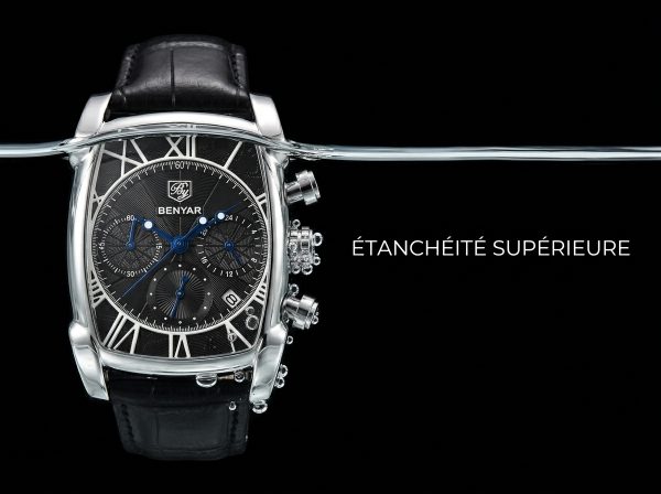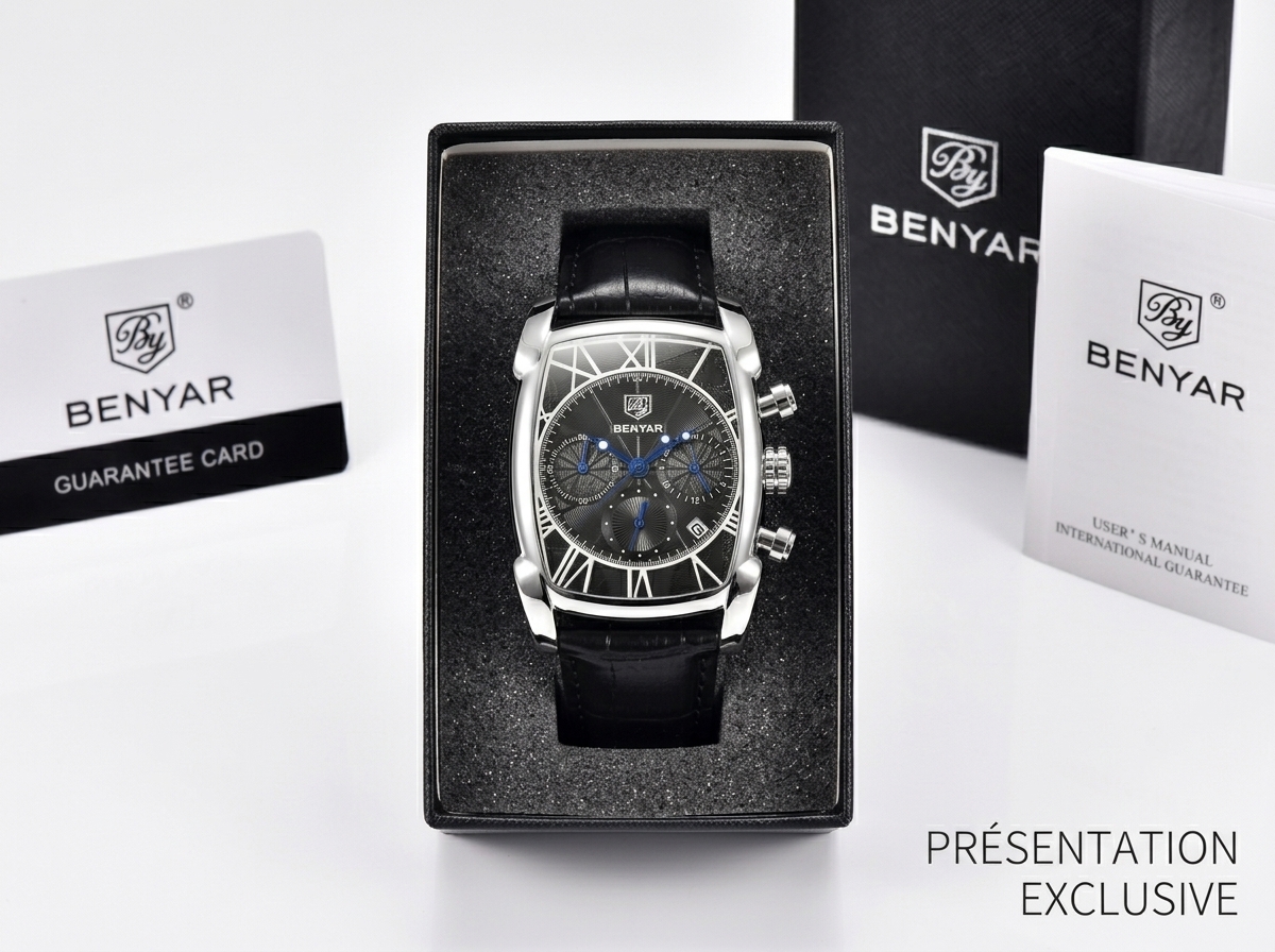 Découvrez l’élégance audacieuse de cette montre chronographe Benyar, un accessoire intemporel qui allie sophistication et fonctionnalité. Son boîtier tonneau en acier et son cadran noir texturé en font un chef-d’œuvre de design, idéal pour l’homme moderne.
