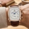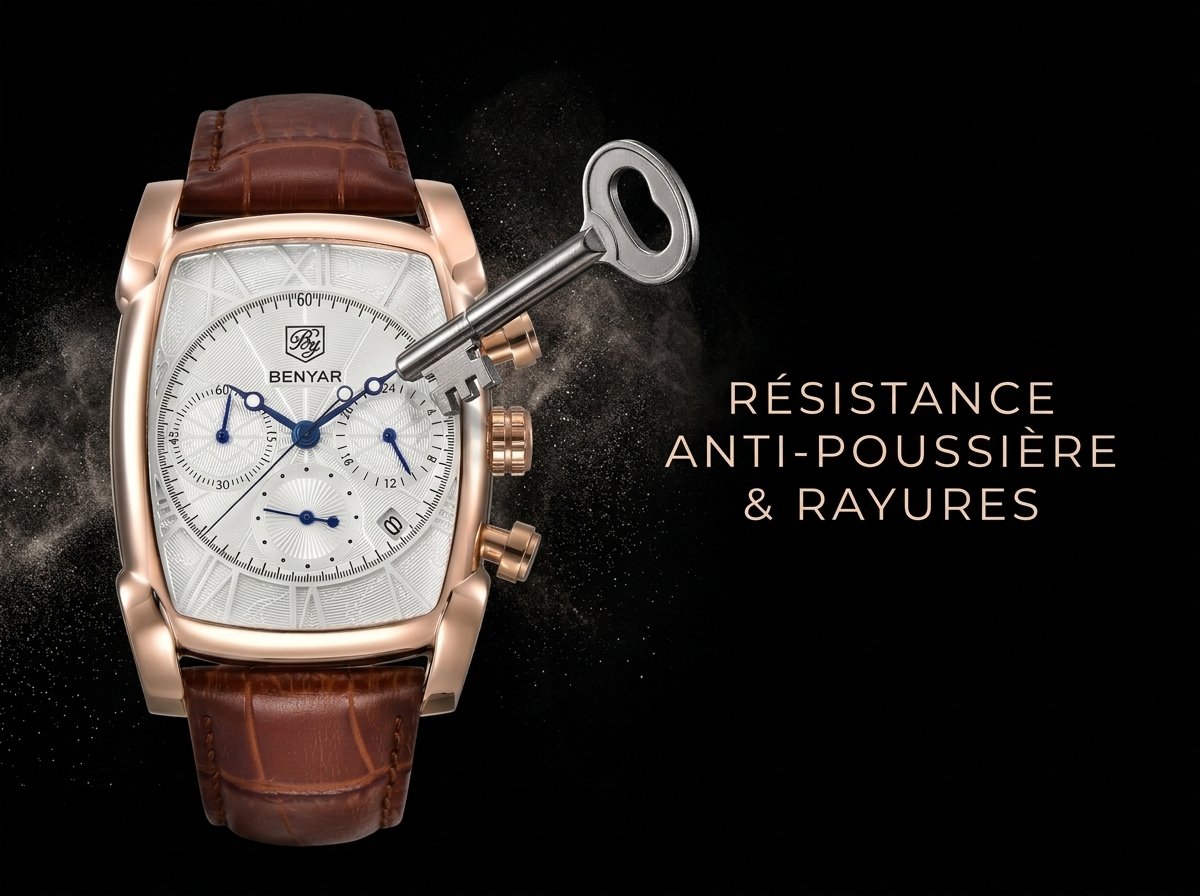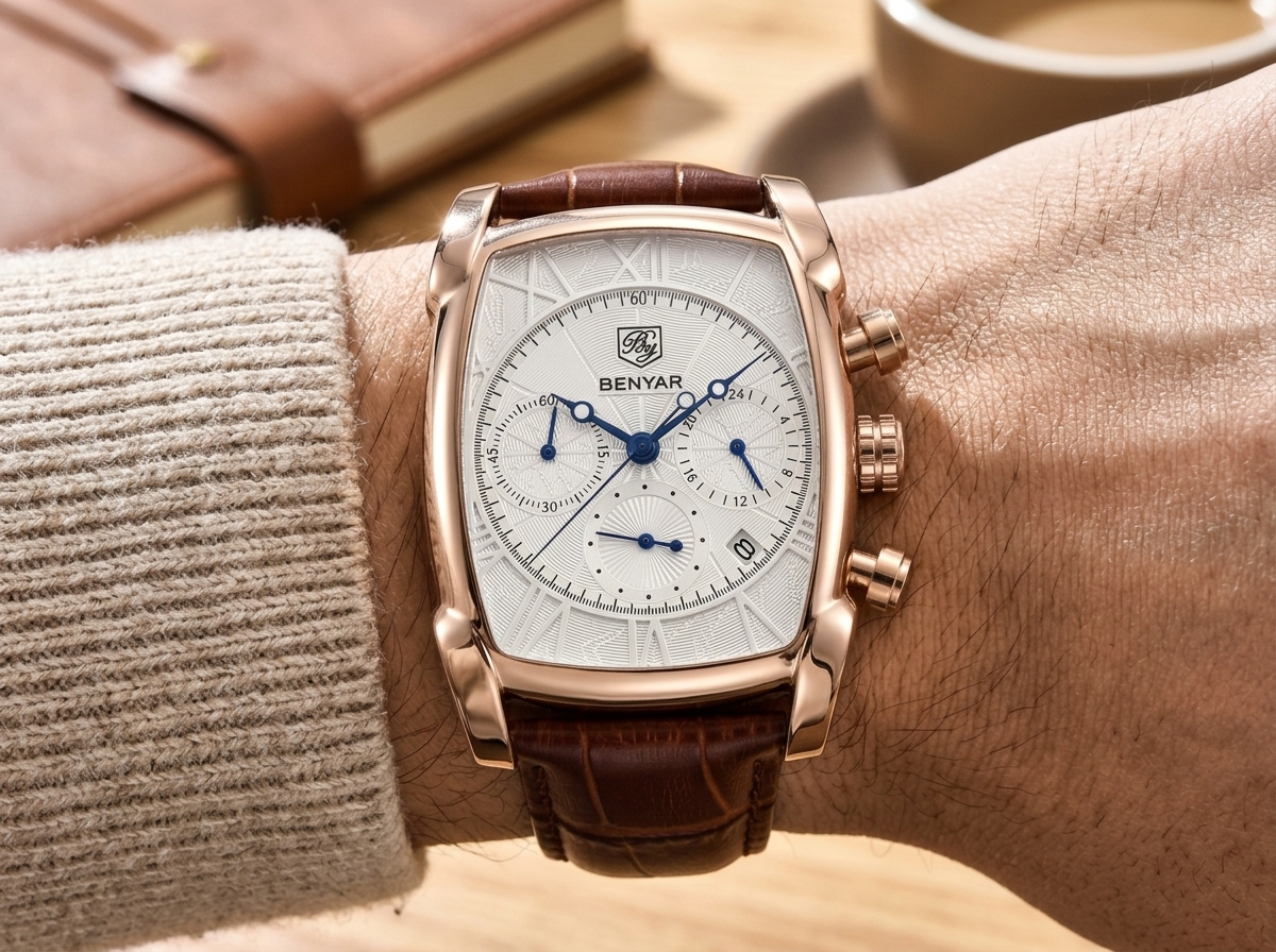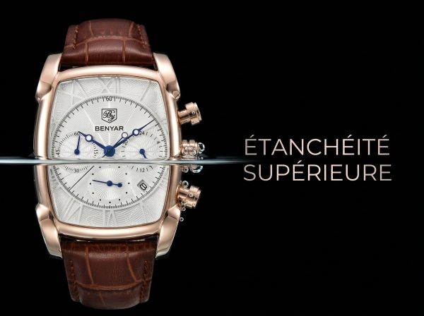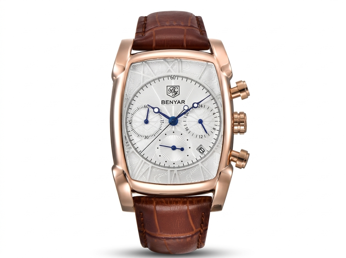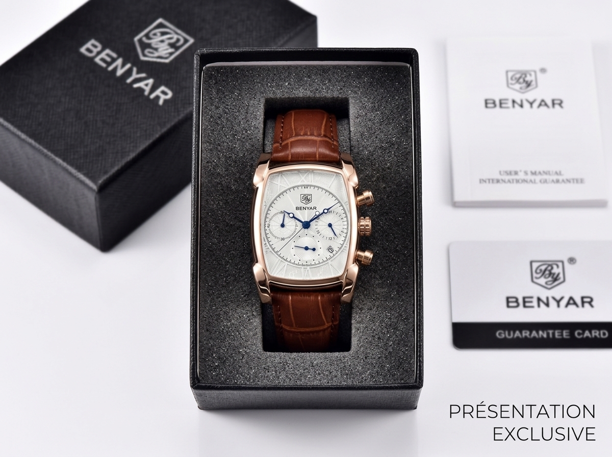 Découvrez l’élégance intemporelle avec cette montre chronographe BENYAR, un accessoire sophistiqué qui rehausse chaque tenue. Son boîtier tonneau doré-rose et son bracelet en cuir marron grainé en font un choix parfait pour l’homme moderne.