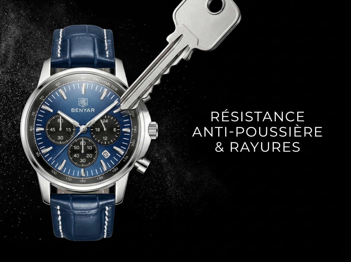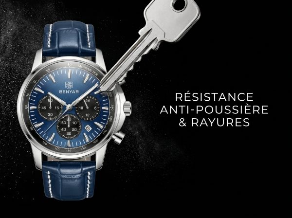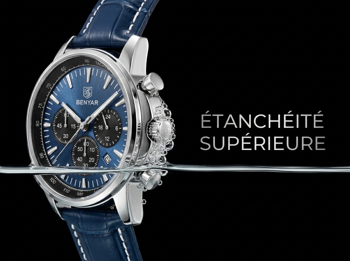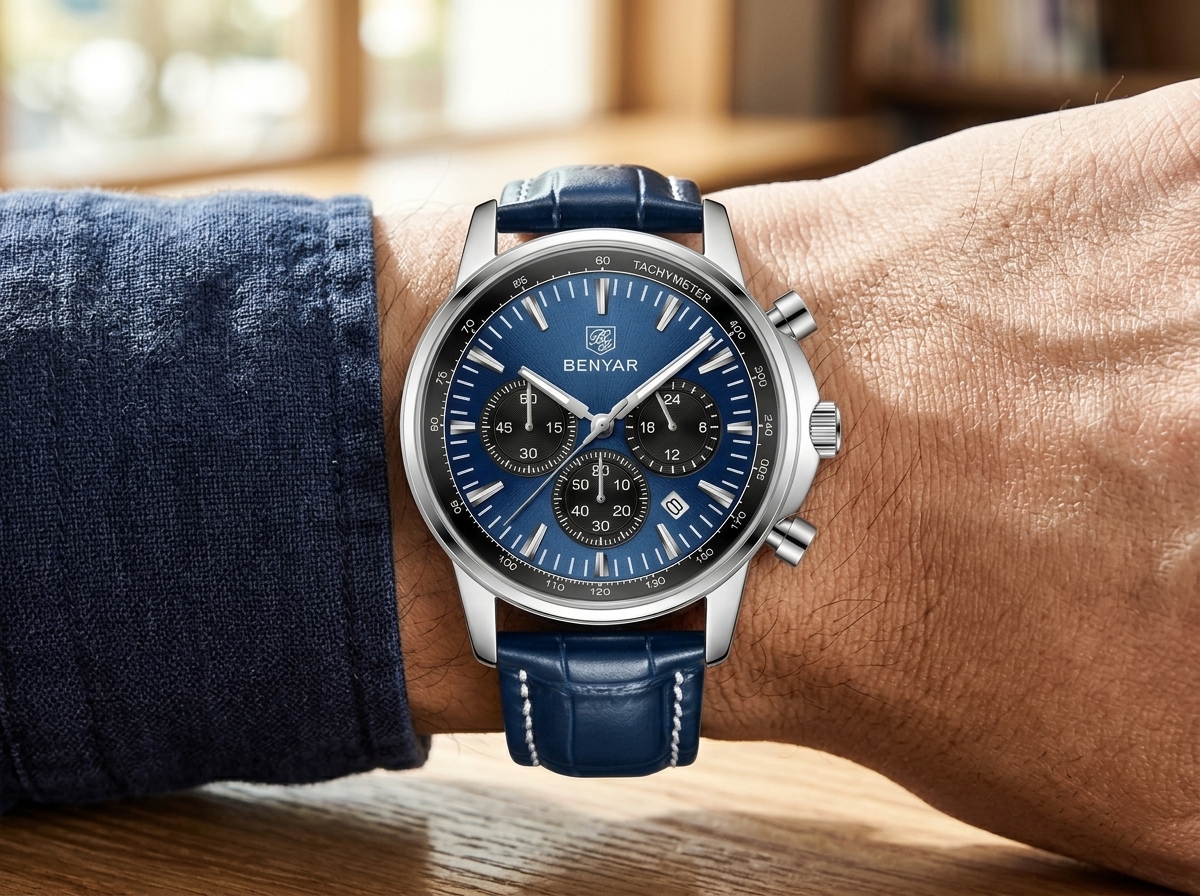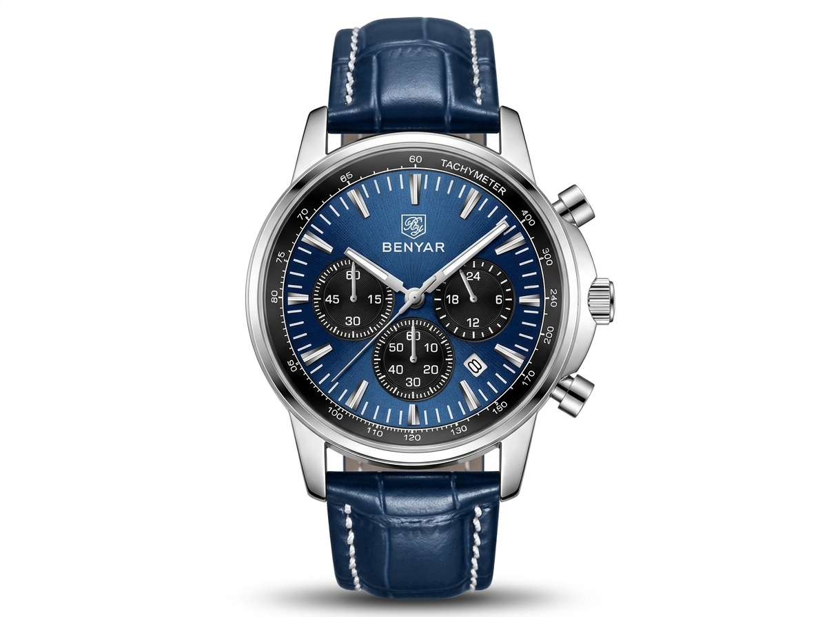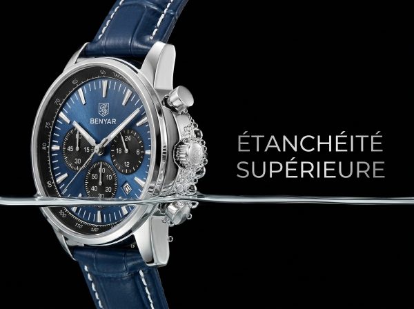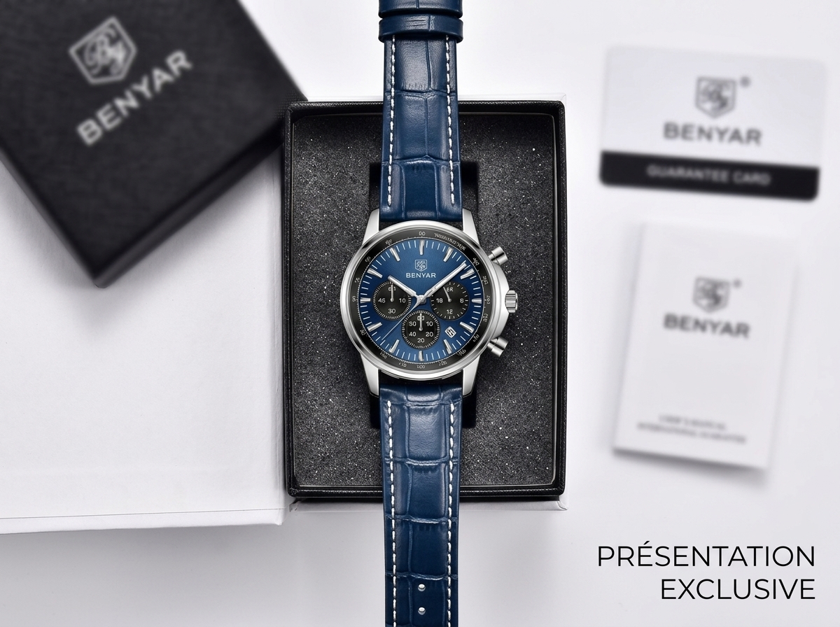 Découvrez l’élégance audacieuse avec cette montre chronographe BENYAR au cadran bleu profond. Son design sportif et raffiné en fait l’accessoire parfait pour l’homme moderne.