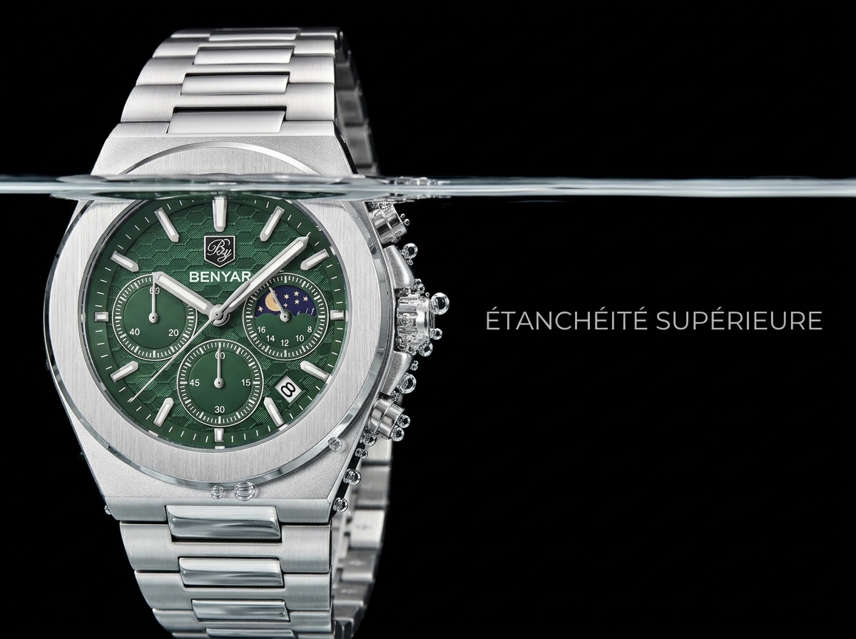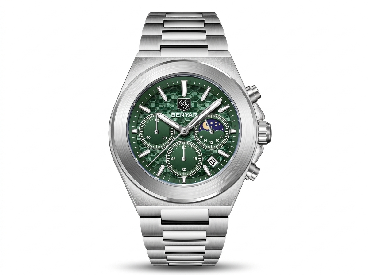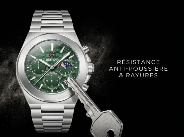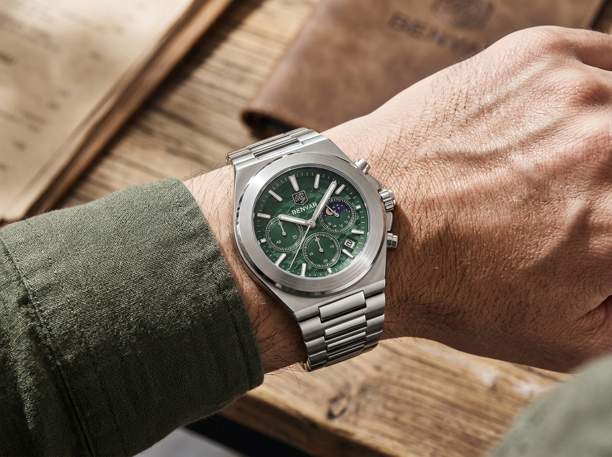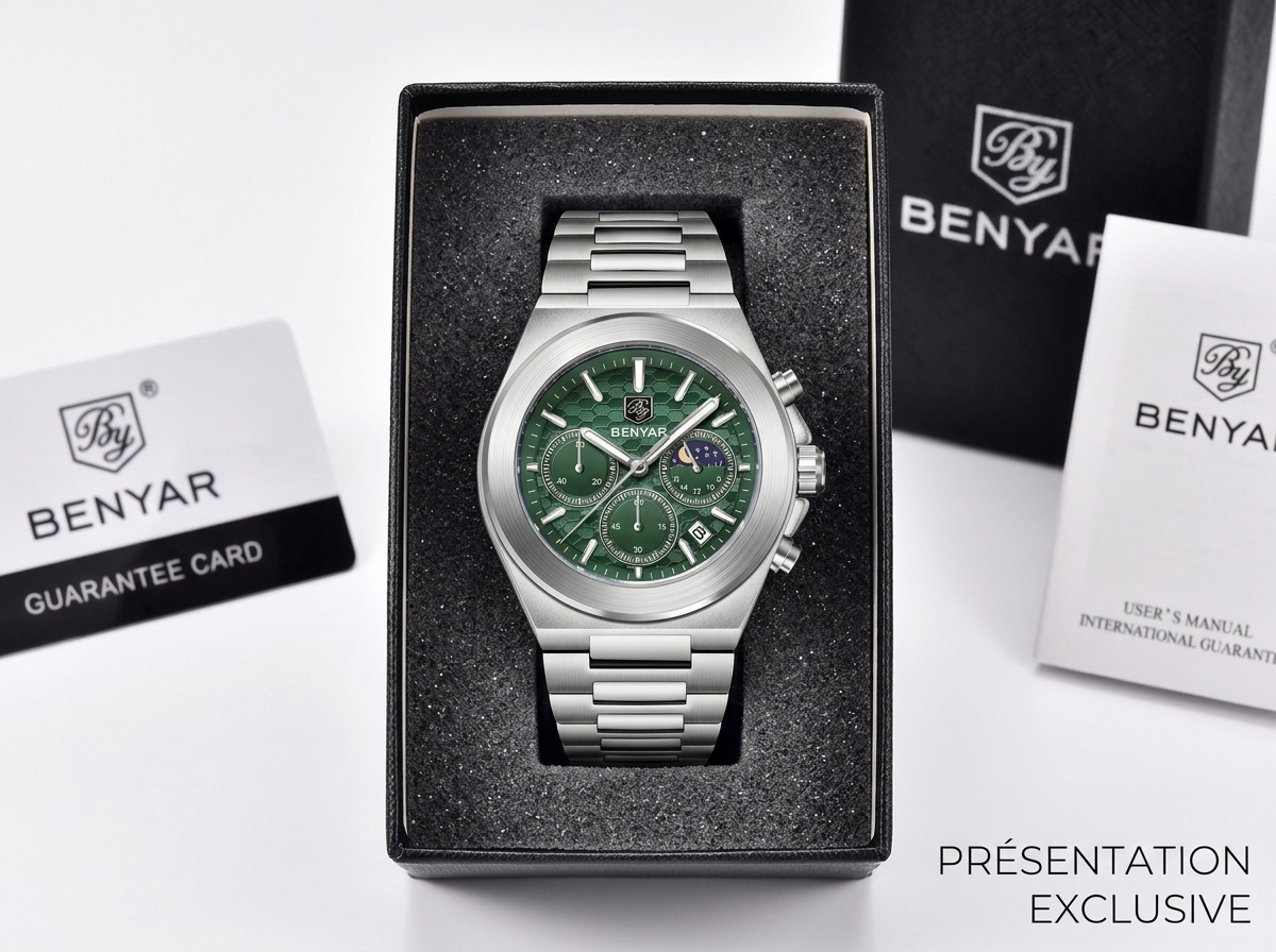 Découvrez l’élégance audacieuse avec cette montre chronographe Benyar, arborant un cadran vert émeraude texturé et des complications raffinées incluant une phase de lune. Un accessoire indispensable qui allie performance sportive et sophistication quotidienne, parfait pour l’homme moderne.