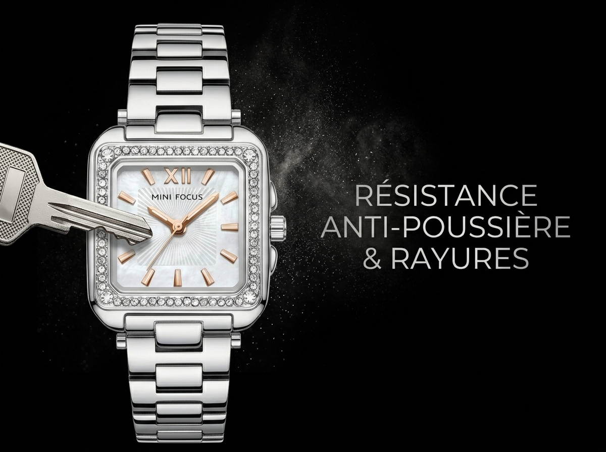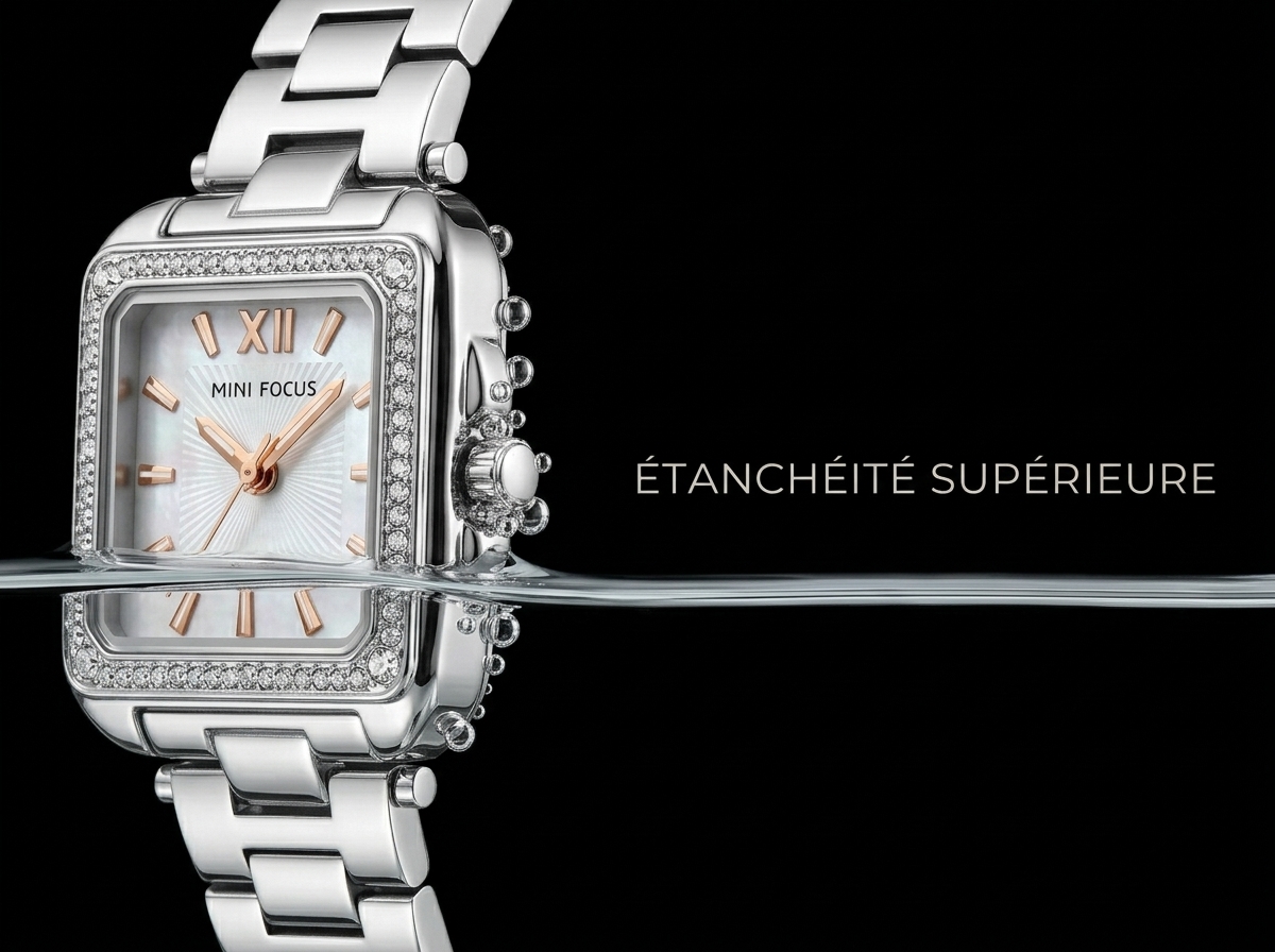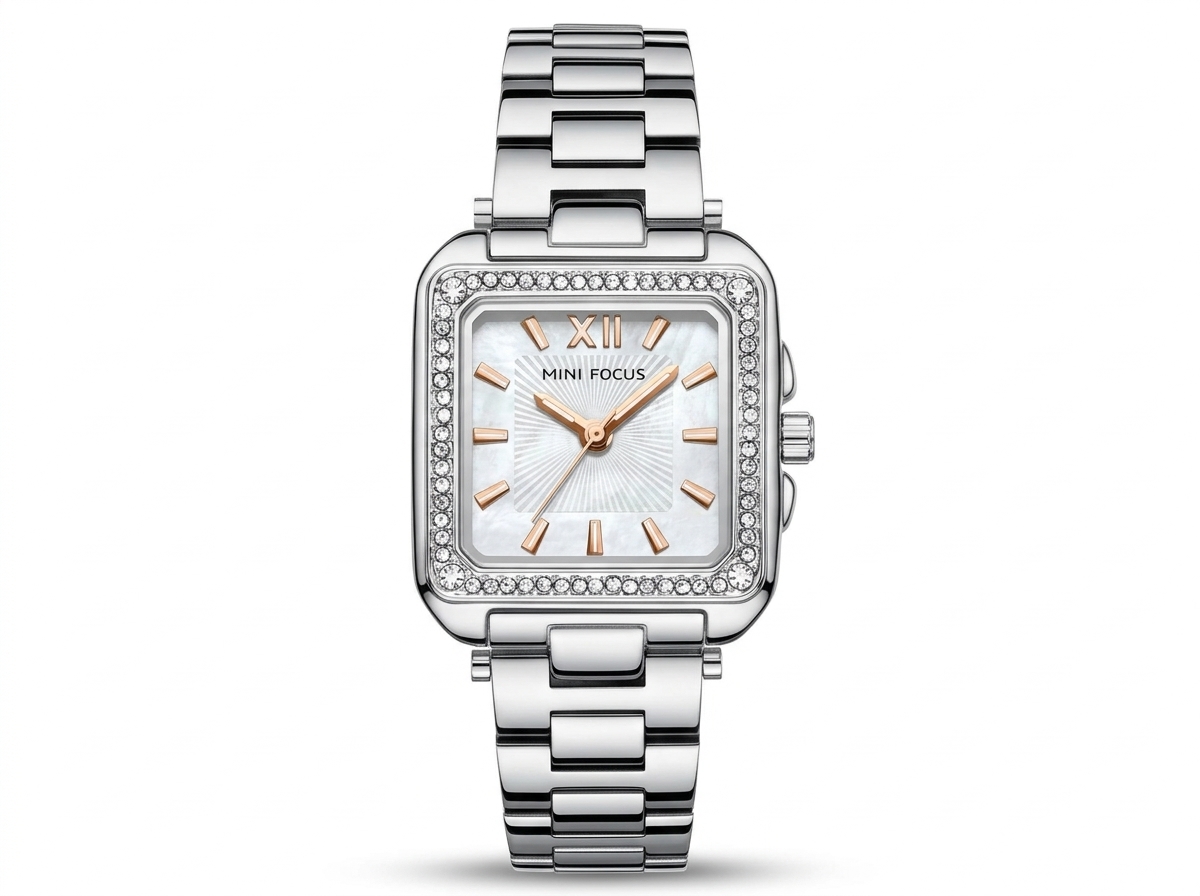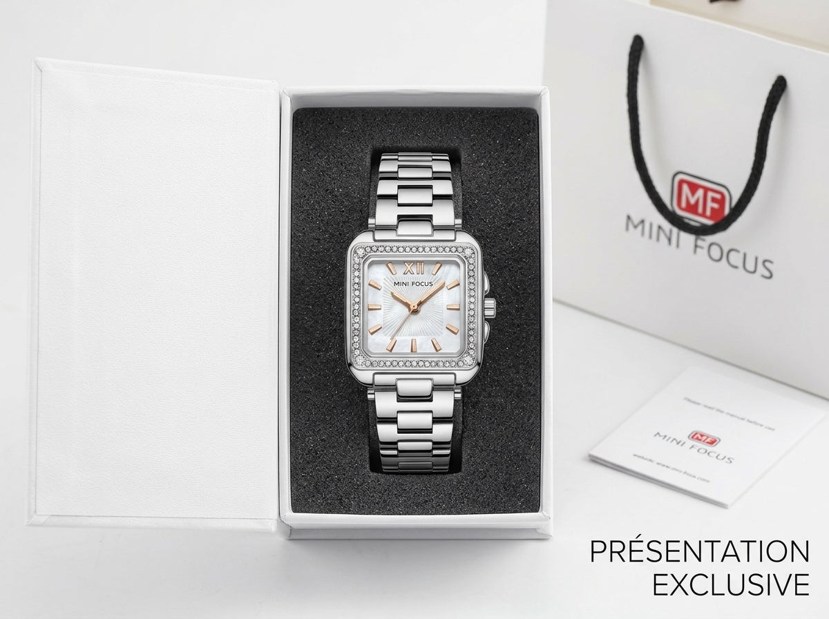 Découvrez l’élégance intemporelle de cette montre MINI FOCUS, un véritable bijou au poignet. Son boîtier carré serti de cristaux étincelants et son cadran en nacre chatoyante apportent une touche de sophistication à chaque tenue.